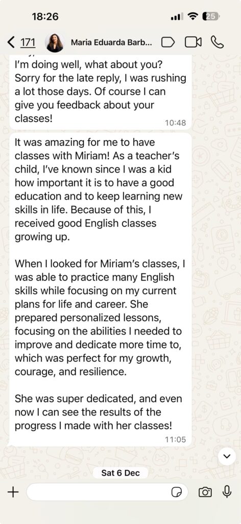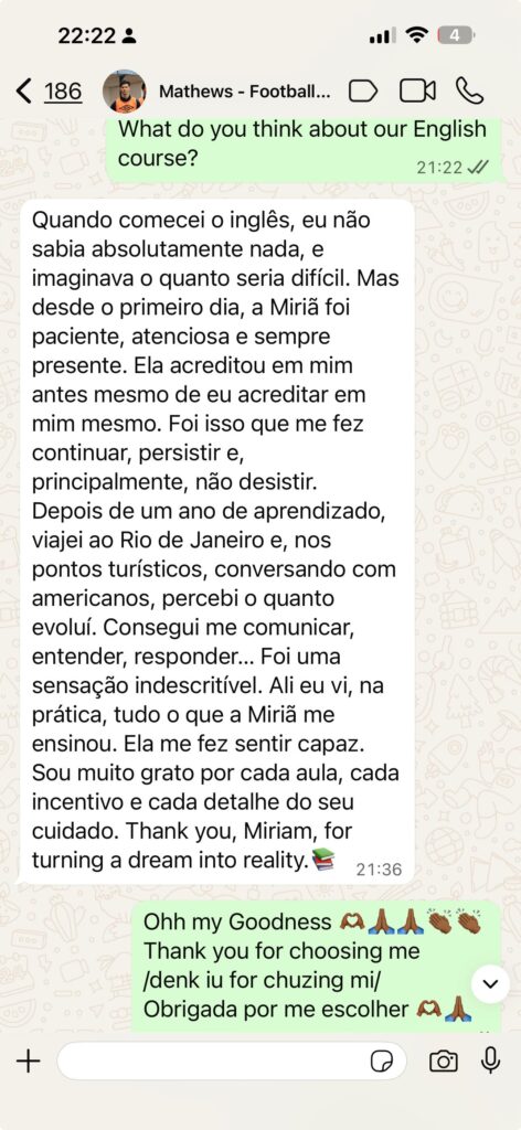 Você vai aprender com um método criado por uma professora nativa, que entende as dificuldades do aluno brasileiro e sabe transformar insegurança em confiança para falar inglês de verdade.